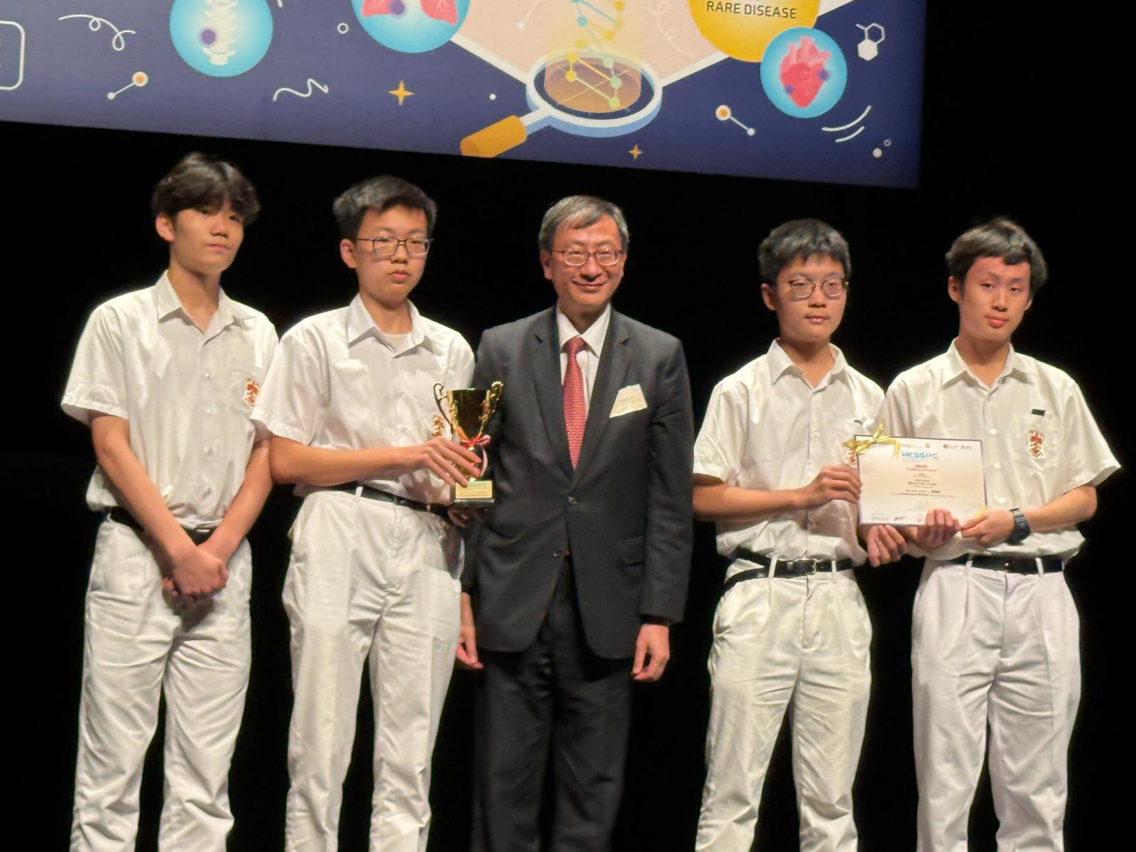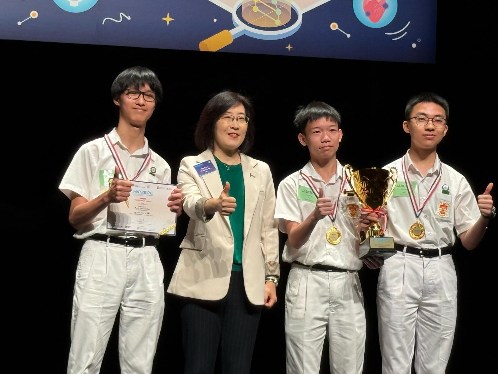 A group of S3 students from science research team designed an eco-friendly adult diaper with odor-neutralizing enzymes, earning them the Champion. Meanwhile, the S4 team investigated advanced molecular recognition using nanoparticle-enhanced natural compounds, receiving Honourable Mention for their research.